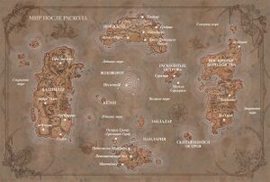 - В World of Warcraft: Chronicle Volume 1 упоминается, что до Великого Раскола древний Калимдор был самым большим континентом на планете,[14] что подразумевает существование большего количества континентов в тот период. Однако в World of Warcraft: Chronicle Volume 3 империя ночных эльфов описывается как расположенная на «единой территории» Азерота.[15] В книге «Древние боги и формирование Азерота» первоначально говорилось, что титаны создали обширные территории Азерота, объединив их в единый континент Калимдор в процессе формирования планеты.