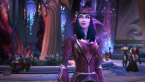 В период войны между Альянсом и Ордой высокорожденные маги, вероятно, открыли портал непосредственно в Пандарию после того, как хранитель знаний Ваэлдрин убедил Тиранду Шелест Ветра санкционировать миссию в древние земли с целью восстановления бессмертия.[74] Дарнасский маг ненадолго появился на вершине Кунь-Лай, чтобы телепортировать божественный колокол в Дарнас.[75] Поскольку ночные эльфы хранили Колокол в Дарнасе для сохранности и изучения, несколько высокорожденных магов позднее телепортировались в Львиный лагерь в Пандарии, запрашивая подкрепление у Альянса и сообщая о скрытой атаке на столицу ночных эльфов.[76] Чудотворец Лунный Шпиль был ночным эльфом-магом 7-го легиона, участвовавшим в сражениях против героев Орды в крепости Покорителей.