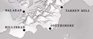 Во время конфликта между Альянсом и Отрекшимися в предгорьях Хилсбрада Даларан разместил свои силы в Янтарной мельнице, крепости Стражей Пустоты, лордамерских выселках и частях Серебряного бора. Изначально Кирин-Тор не знал об Отрекшихся, считая их очередным кланом нежити,[86] пока не произошло столкновение из-за Янтарной мельницы. Впоследствии ворам артефактов кровавого камня во главе с Кеганом Мракмаром было предоставлено убежище от Отрекшихся, и реликвии были помещены под карантин магами в лордамерских выселках.[87]