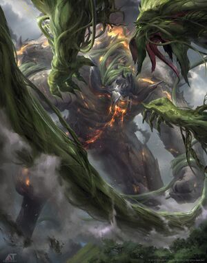Простые корни оказались неспособны остановить Гронда; спорогоры начали адаптироваться.[4] Высасывая жизненную силу из окружающих лесов и джунглей, три спорогоры восстали и выступили против Гронда: Занг, Наану и Ботаан. Несмотря на то, что Вечнорастущие позволили трем спорогорам сражаться согласованно, огромная сила Гронда позволила ему сокрушить Занга и Наану. Труп Занга превратился в Зангарское море, а Наану — в Танаанские джунгли.