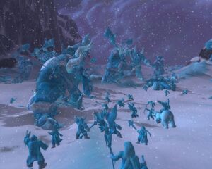 Согласно истории, много веков назад, после того как хранитель Локен был осквернен Йогг-Сароном, он убил жену своего брата Торима, Сиф, и обманным путем убедил Торима в том, что король Арнгрим и снежные великаны виновны в этом преступлении. В ярости Торим метнул свой молот, Кролмир, в Арнгрима, который в тот момент сражался с кланом снежных дворфов. Взрыв от удара Кролмира о землю убил всех, кто находился поблизости, и заморозил всю сцену навечно, запечатлев момент, когда ударная волна подбросила многих дворфов в воздух.[6]