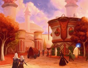 В границах Кель'Таласа цивилизация процветала. Не боясь больше использовать магию, высшие эльфы создали чудесные пейзажи, которые омыли их королевство вечной весной. Никогда больше не повторится зима, столь же жестокая, как та, которую они пережили на пути к этой заветной земле. Их столица, город Луносвет, стала сияющим монументом в память о древней империи эльфов. Луносвет был построен из сияющего белого камня и украшен малиновыми гобеленами.[16] Создав новую империю, Дат'Ремар покинул пост ее лидера. Его род унаследовал волшебное королевство мира и процветания. Его прекрасные дворцы, построенные в том же архитектурном стиле, что и древние залы Калимдора, были вплетены в природный рельеф земли. Кель'Талас стал той сияющей жемчужиной, которую эльфы так долго мечтали создать. В качестве правящей силы над Кель'Таласом был основан совет Луносвета, хотя династия Солнечных Скитальцев сохранила часть политической власти. Состоящий из семи величайших лордов высших эльфов, совет работал над обеспечением безопасности эльфийских земель и народа, и Кель'Талас процветал в мире. Однако эта эпоха закончилась, когда мантию лидера принял правнук Дат'Ремара, Анастериан Солнечный Скиталец. Он пришел к власти в то время, когда его народу снова грозила война с троллями.