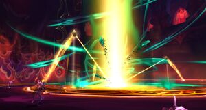 В то время как силы Альянса и Орды были сосредоточены на Черном храме, Кель'тас и его союзники из Легиона вернулись в Кель'Талас через Темный портал.[40] Его армия направилась к Солнечному Колодцу через портал у Трона Кил'джедена.[41] Он совершил кратковременное нападение на Луносвет со своими эльфами-сквернокровами, чтобы захватить М'ууру. Леди Лиадрин, матриарх рыцарей крови, лично ставшая свидетельницей произошедшего, отправилась в Шаттрат, отказавшись от династии Солнечных Скитальцев и предложив сотрудничество с Ша'тар в борьбе за Луносвет.[42]