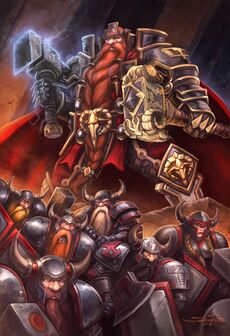 Исторически верховный король дворфов представлял собой главенствующего лидера объединенных кланов дворфов.[53] Однако после войны Трех Кланов и разделения основных семей королевства, этот титул остался невостребованным. После воссоединения кланов, принц Дагран Тауриссан II, по-видимому, будет коронован в качестве следующего верховного короля дворфов по достижении совершеннолетия.