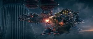 Усмиритель небес — удивительное творение гномской и дворфийской инженерной мысли — приводится в движение многочисленными мощными винтовыми двигателями. Он вооружен более чем двадцатью широкоствольными пушками, защищен массивными батареями орудий спереди и сзади, а его экипаж состоит из морских пехотинцев, готовых вступить в бой в любой момент. На нижней палубе корабля находится массивная бомба.