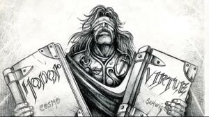 В гробнице Утера на надгробии он был изображен в героической позе, в одной руке — фолиант Света, в другой — боевой молот. Перед ним находился камень с надписью на всеобщем: