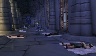 В период сожжения Тельдрассила жрецы церкви находились в Штормграде, оказывая помощь голодным, измученным и испуганным беженцам из Дарнаса.[62] Они также непрерывно благословляли магов, поддерживающих работу порталов.[63] Беженцы из Тельдрассила, как люди, так и ночные эльфы, были доставлены в переполненный Собор Света, где им оказывали помощь жрецы Штормграда и королева Миа Седогрив.