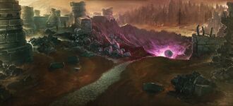 Король Вариан Ринн сражается с демонами из Пылающего Легиона перед гробницей Саргераса.