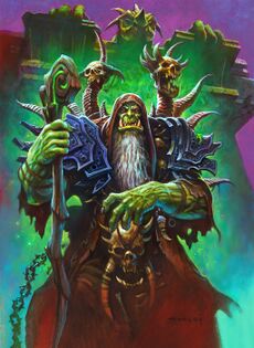 Во время войны в Дреноре чернокнижники изначально были запрещены в рядах Железной Орды, но Гул'дан подготовил целое поколение чернокнижников, чтобы они могли сражаться против сил Азерота,[33] сначала в качестве членов Совета Теней, а затем как железные слуги Легиона. Представители клана Призрачной Луны также назывались чернокнижниками, поскольку они использовали Бездну для связывания душ и управления нежитью.[34]